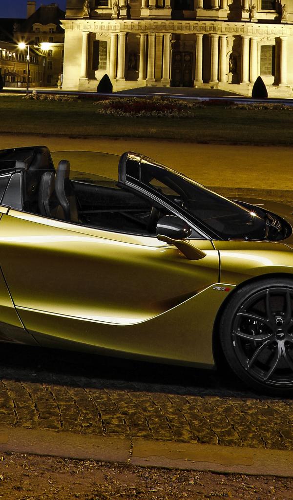 Обои Золотистый спортивный автомобиль McLaren 720S, 2019 года на улице города