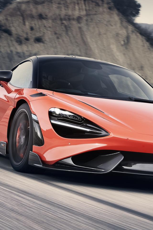 Обои Красный автомобиль McLaren 765LT 2020 года на дороге в горах