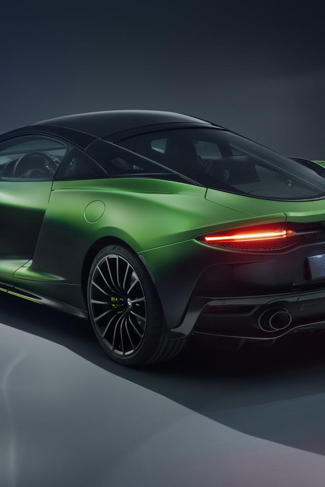 Обои Быстрый зеленый автомобиль McLaren GT Verdant, 2020 года на сером фоне
