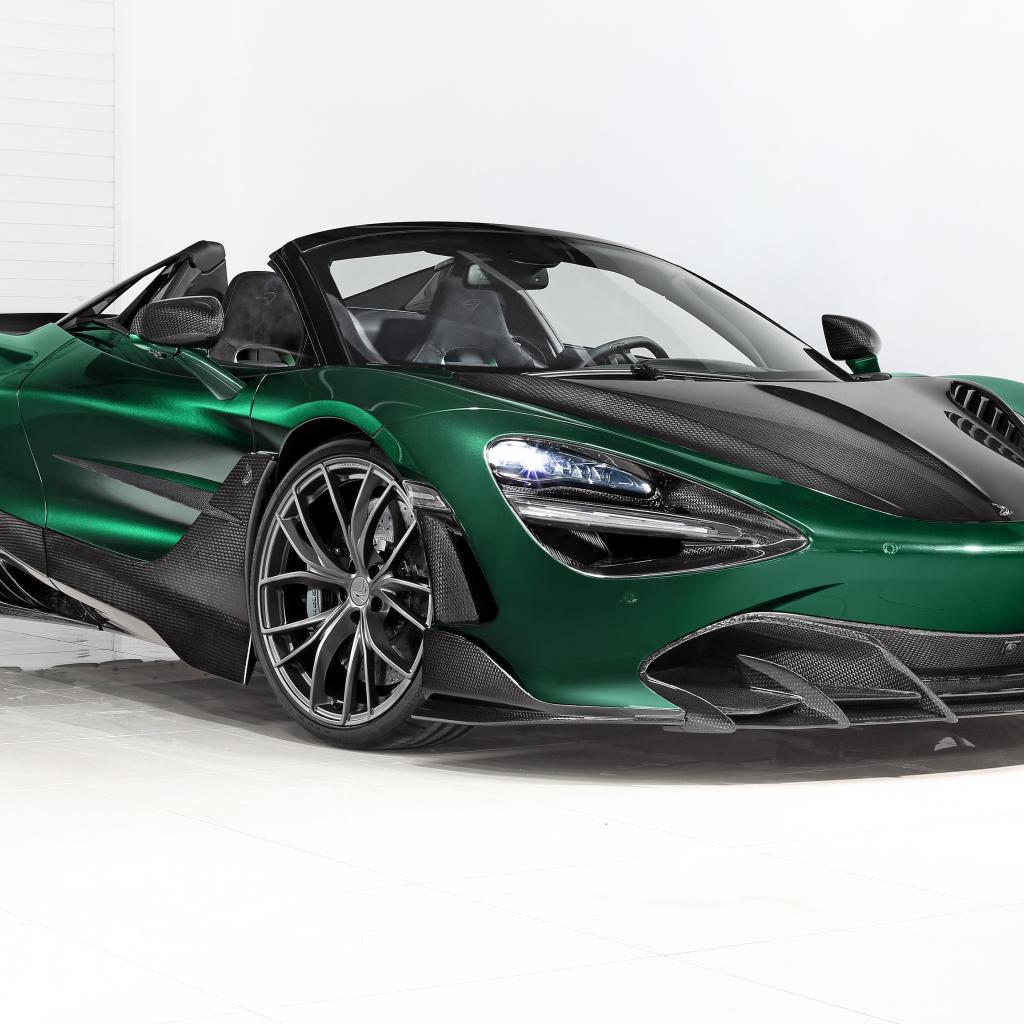 Обои Зеленый автомобиль McLaren 720S Spider Fury 2020 года на белом фоне