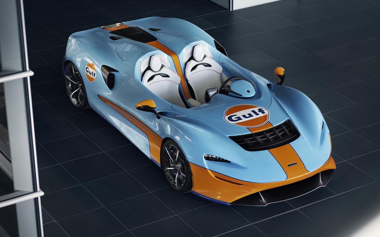 Обои Спортивный автомобиль McLaren Elva Gulf Theme By MSO 2021 года вид сверху