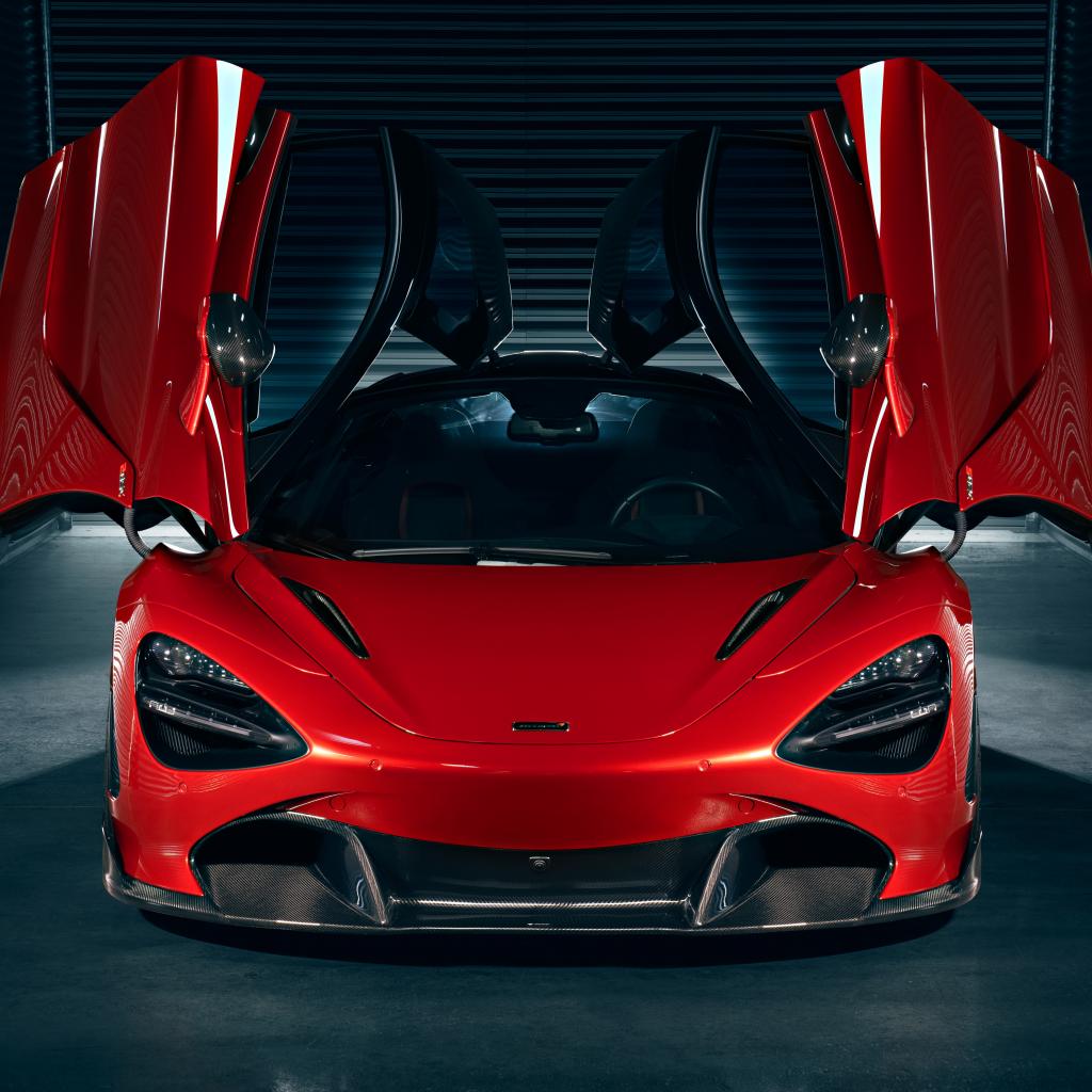 Обои Красный автомобиль McLaren 720S с открытыми дверями в гараже