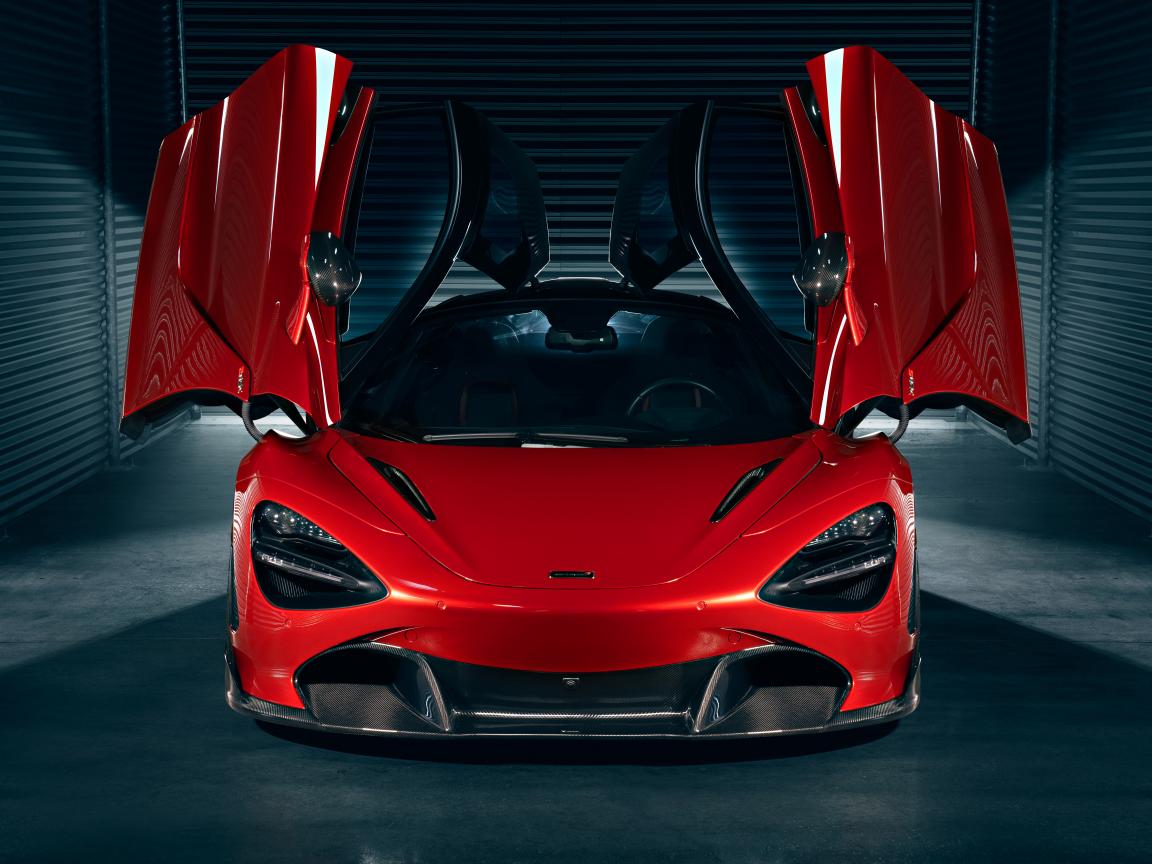 Обои Красный автомобиль McLaren 720S с открытыми дверями в гараже