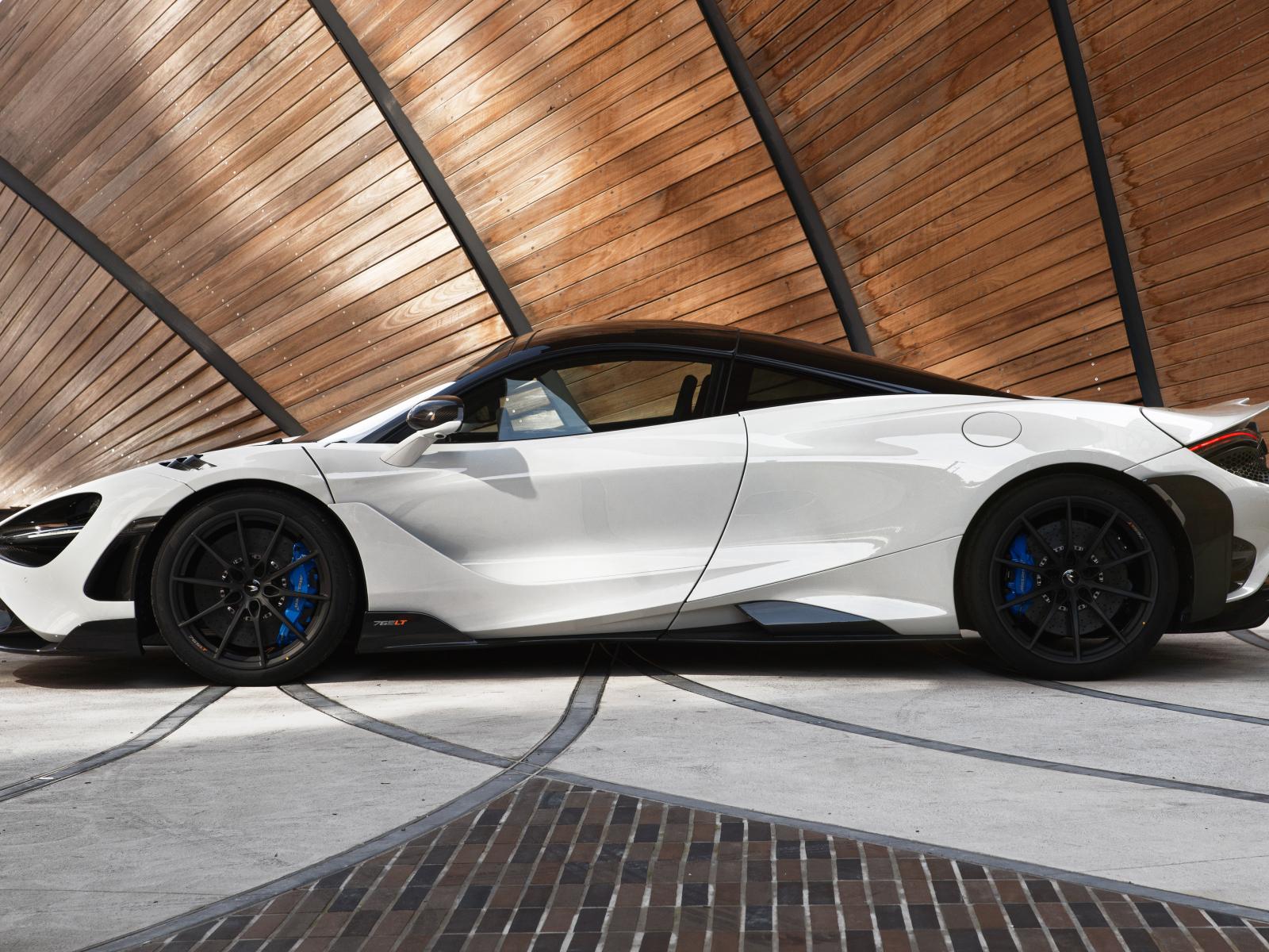 Обои Белый автомобиль McLaren 765LT, 2021 года вид сбоку