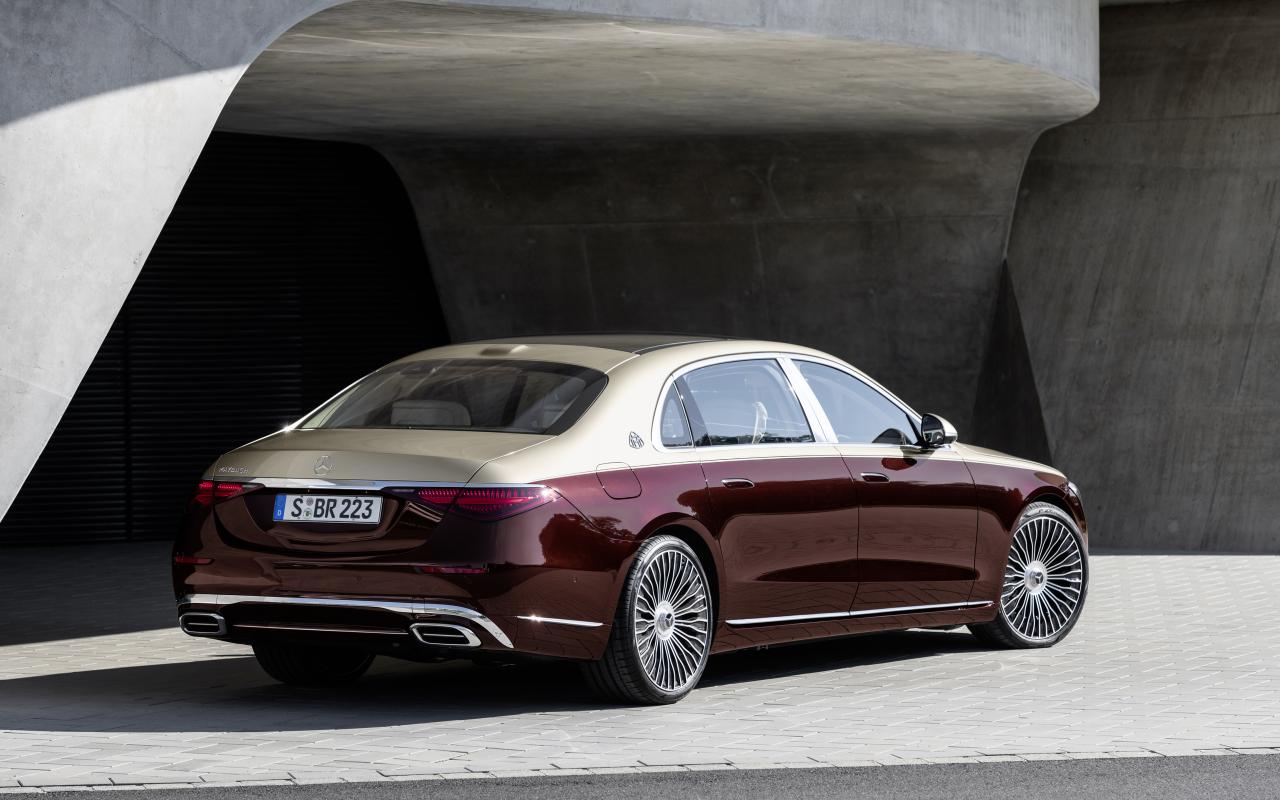 Обои Бордовый автомобиль Mercedes-Maybach S 580, 2021 года вид сзади