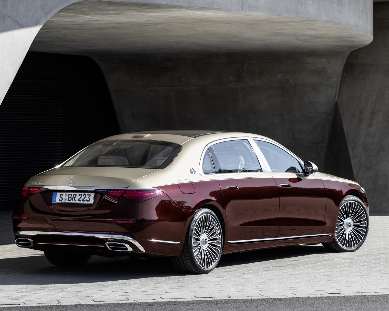 Обои Бордовый автомобиль Mercedes-Maybach S 580, 2021 года вид сзади