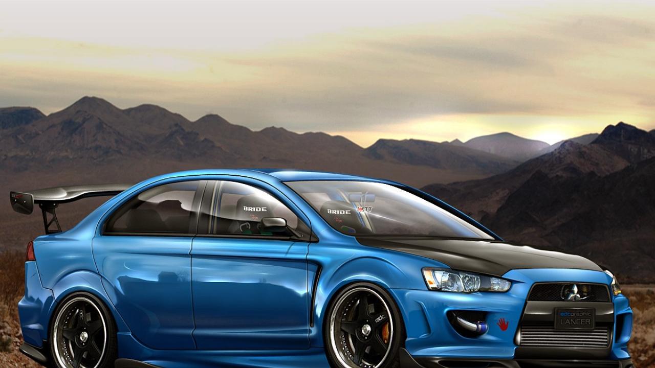 Обои Голубой Mitsubishi Lancer Evo X на фоне гор