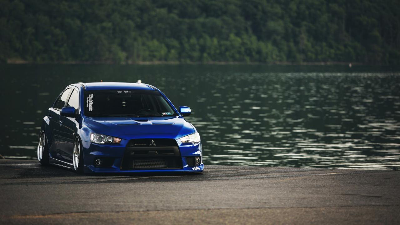 Обои Mitsubishi Lancer Evo X голубого цвета у водоема