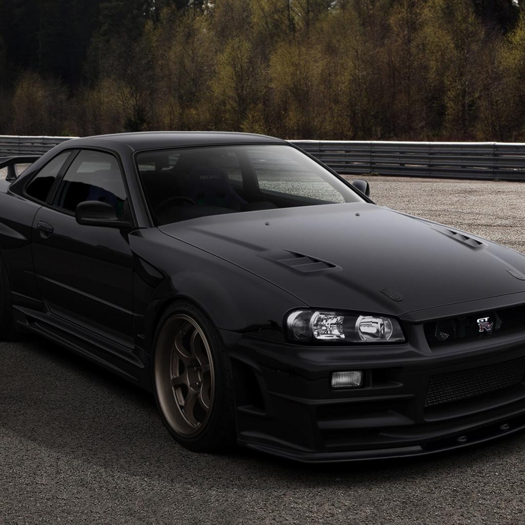 Обои Черный автомобиль Nissan Skyline GT-R R34 на трассе