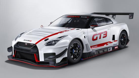 Обои Спортивный автомобиль Nissan GT-R Nismo GT3, 2018 на сером фоне
