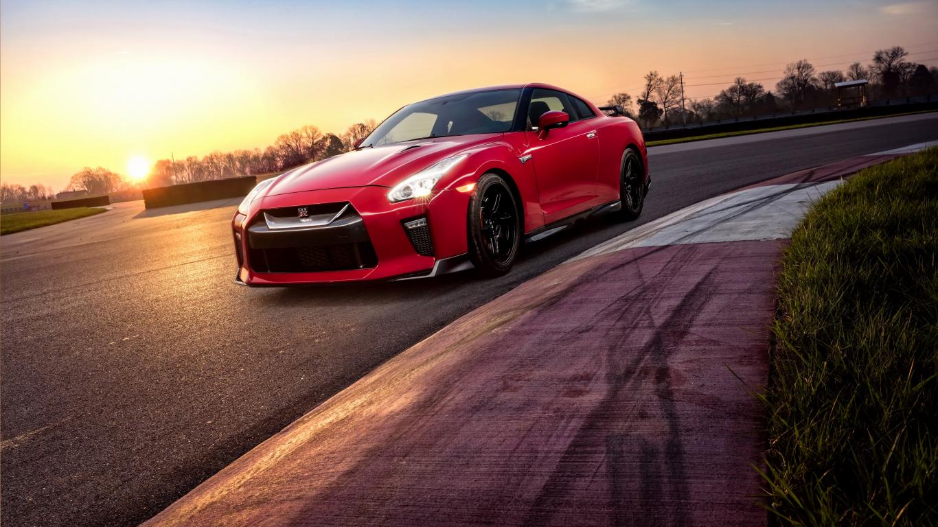 Обои Красный автомобиль Nissan GT-R 2018 года на трассе на закате