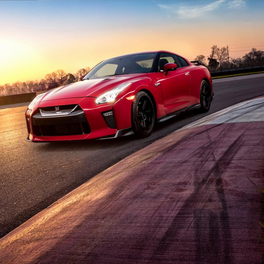 Обои Красный автомобиль Nissan GT-R 2018 года на трассе на закате