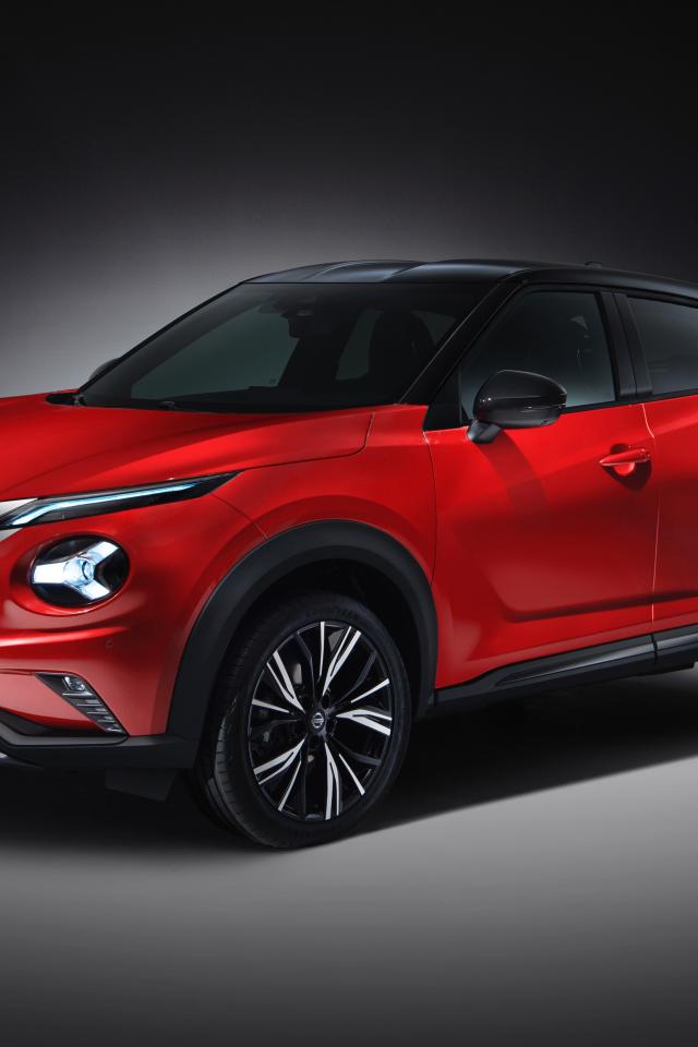 Обои Красный автомобиль Nissan Juke 2019 года на сером фоне