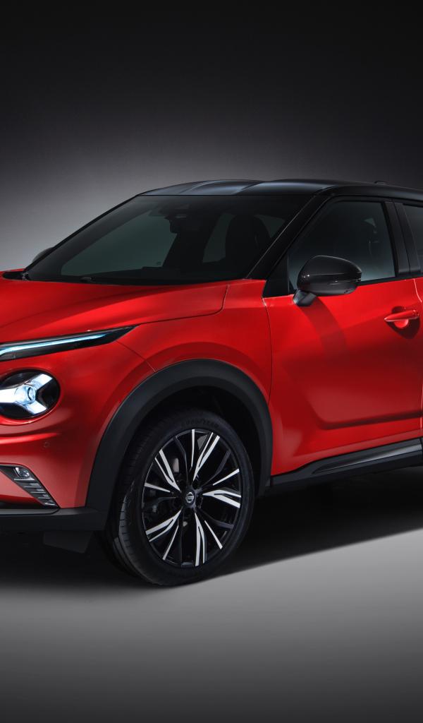 Обои Красный автомобиль Nissan Juke 2019 года на сером фоне