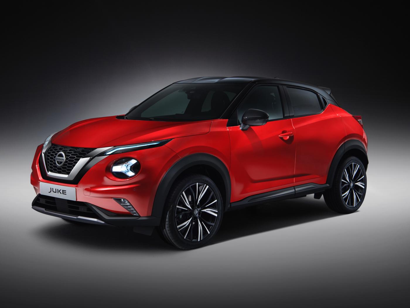 Обои Красный автомобиль Nissan Juke 2019 года на сером фоне