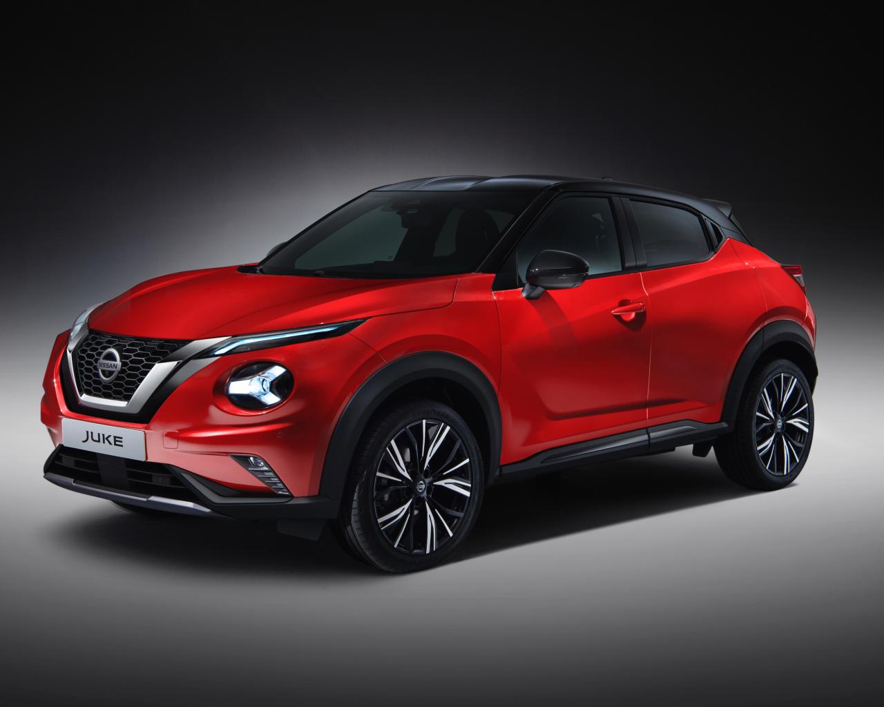 Обои Красный автомобиль Nissan Juke 2019 года на сером фоне