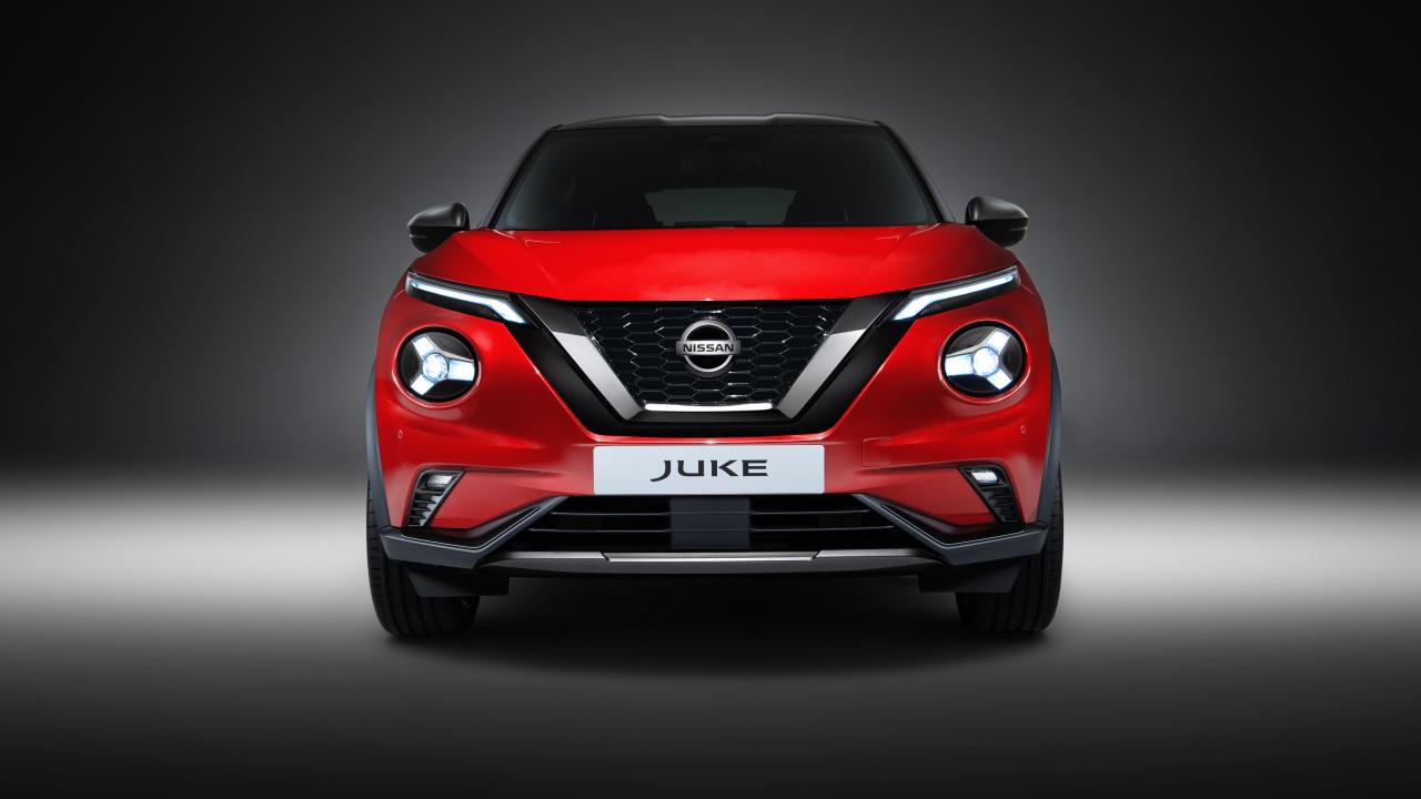 Обои Красный автомобиль Nissan Juke 2019 года вид спереди