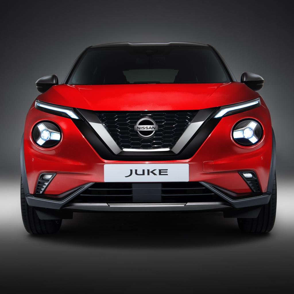 Обои Красный автомобиль Nissan Juke 2019 года вид спереди