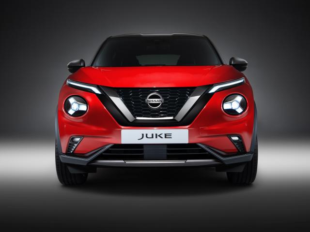Обои Красный автомобиль Nissan Juke 2019 года вид спереди