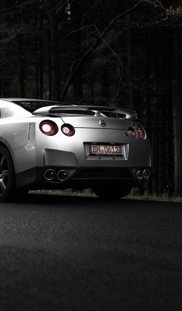 Обои Серебристый Nissan GT-R на фоне темного леса