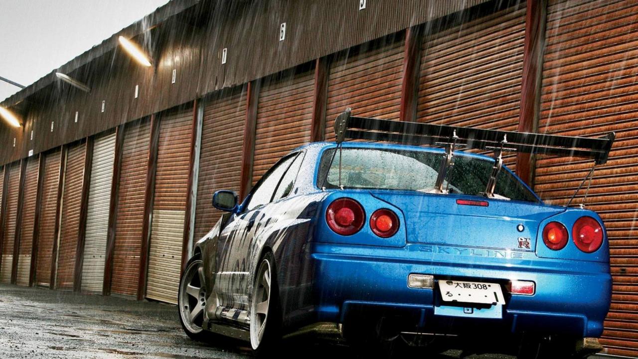 Обои Синий Nissan Skyline GT-R R34 во время дождя