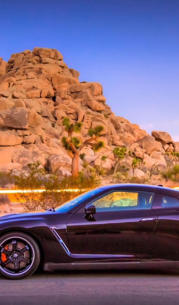 Обои Автомобиль Nissan GT-R на фоне скалы