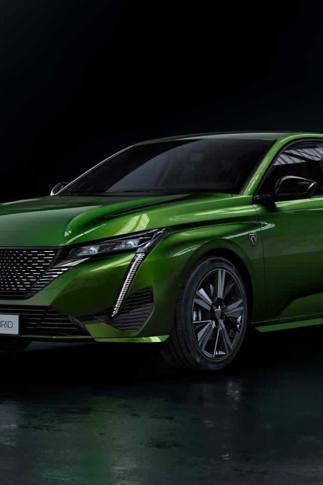 Обои Зеленый автомобиль Peugeot 308, 2021 года на заправке