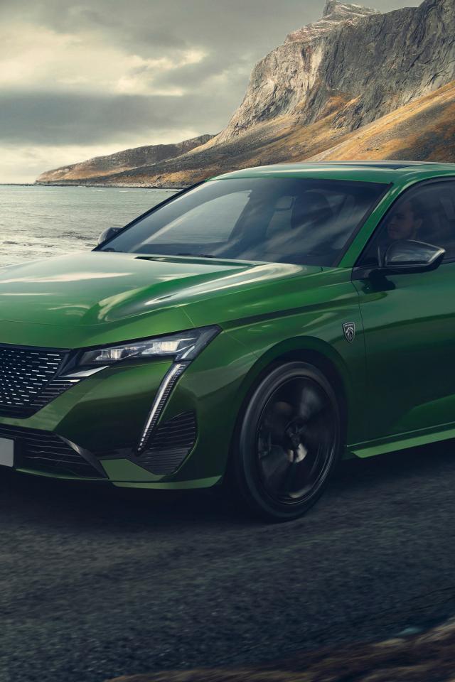 Обои Зеленый автомобиль Peugeot 308, 2021 года у моря