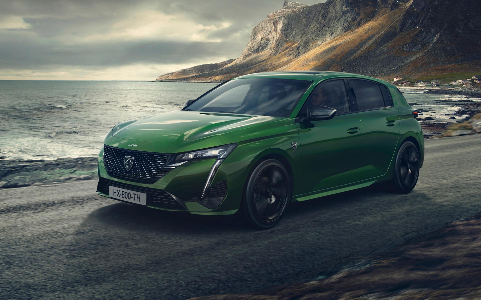 Обои Зеленый автомобиль Peugeot 308, 2021 года у моря