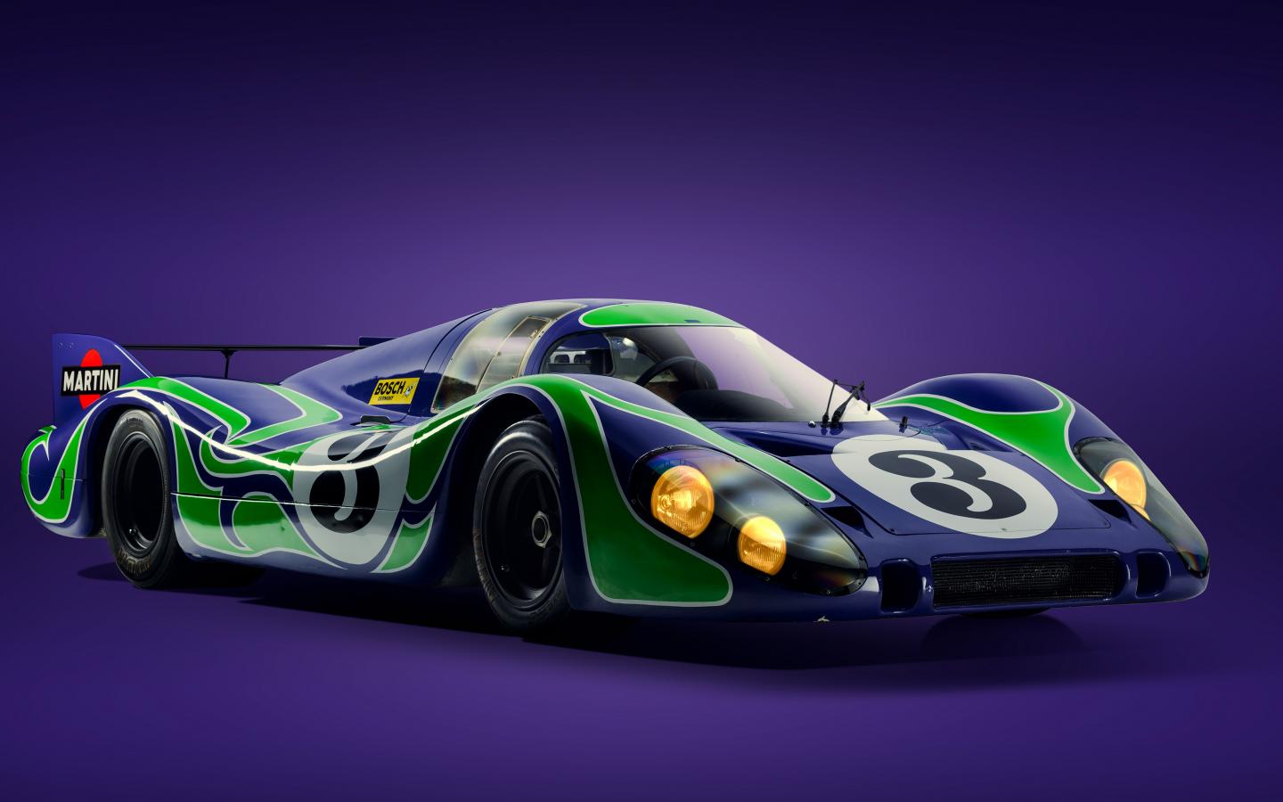 Обои Гоночный автомобиль Porsche 917 Langheck на сиреневом фоне