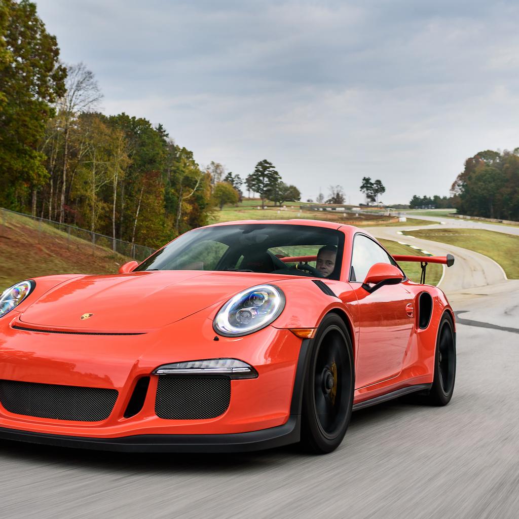 Обои Оранжевый спортивный автомобиль Porsche 911 GT3 на трассе