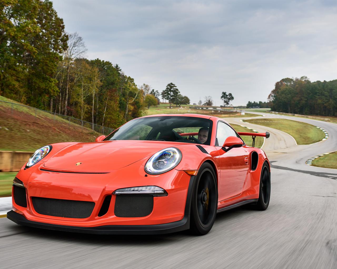 Обои Оранжевый спортивный автомобиль Porsche 911 GT3 на трассе