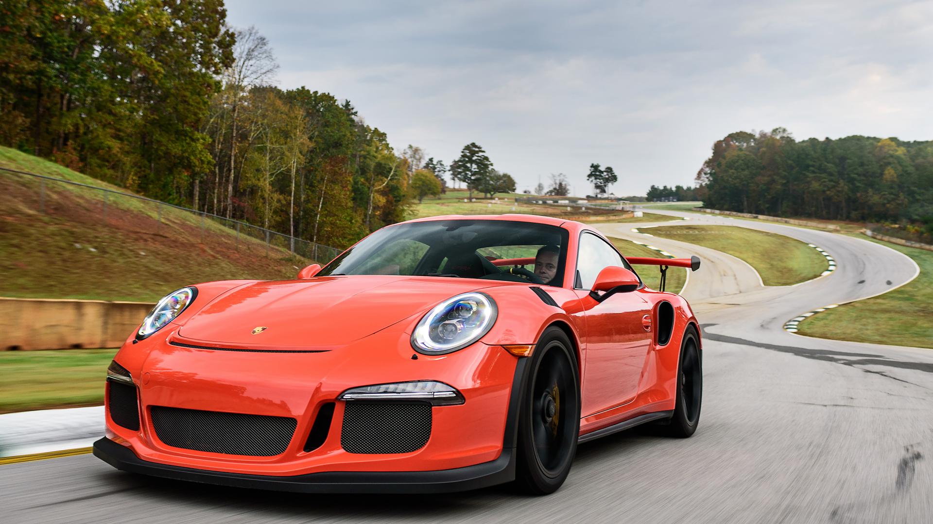 Обои Оранжевый спортивный автомобиль Porsche 911 GT3 на трассе