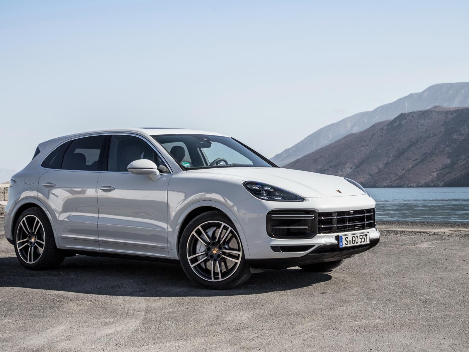 Обои Белый автомобиль Porsche Cayenne Turbo, 2018 у воды