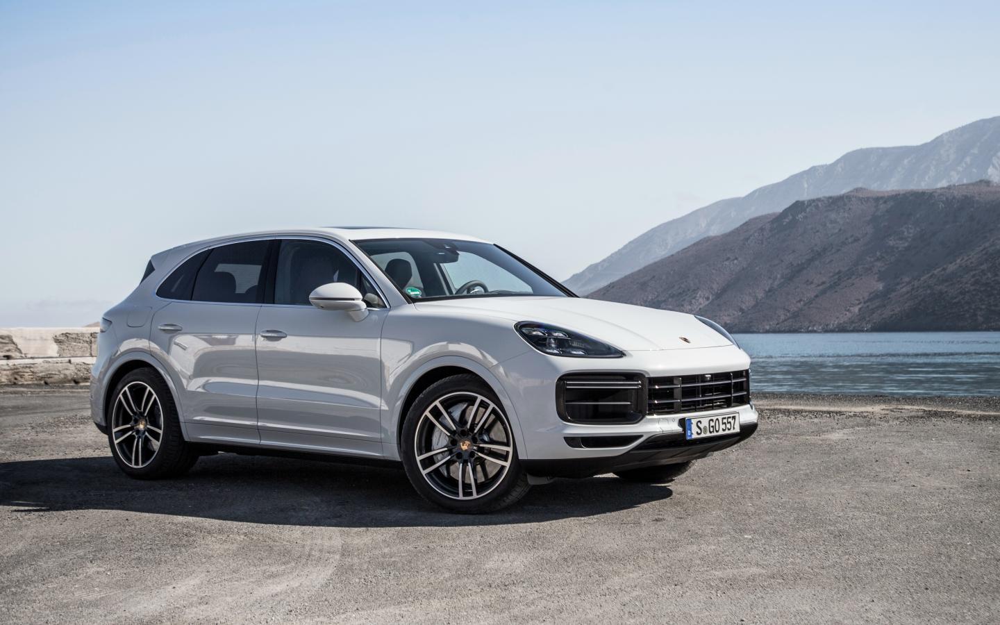 Обои Белый автомобиль Porsche Cayenne Turbo, 2018 у воды