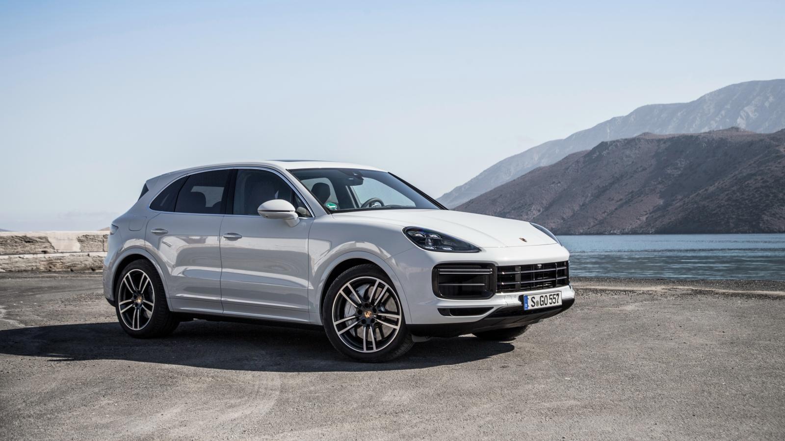 Обои Белый автомобиль Porsche Cayenne Turbo, 2018 у воды