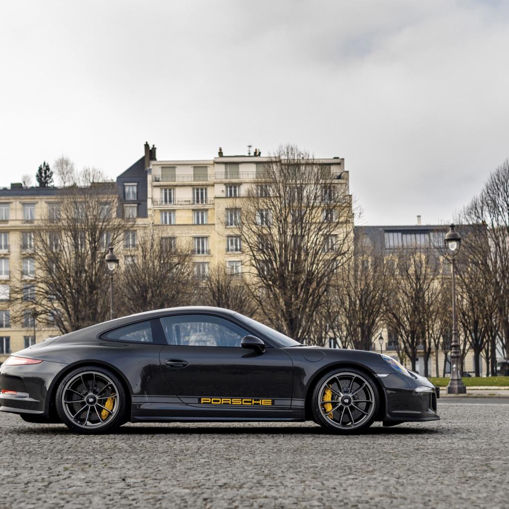 Обои Черный спортивный автомобиль Porsche 911 в городе