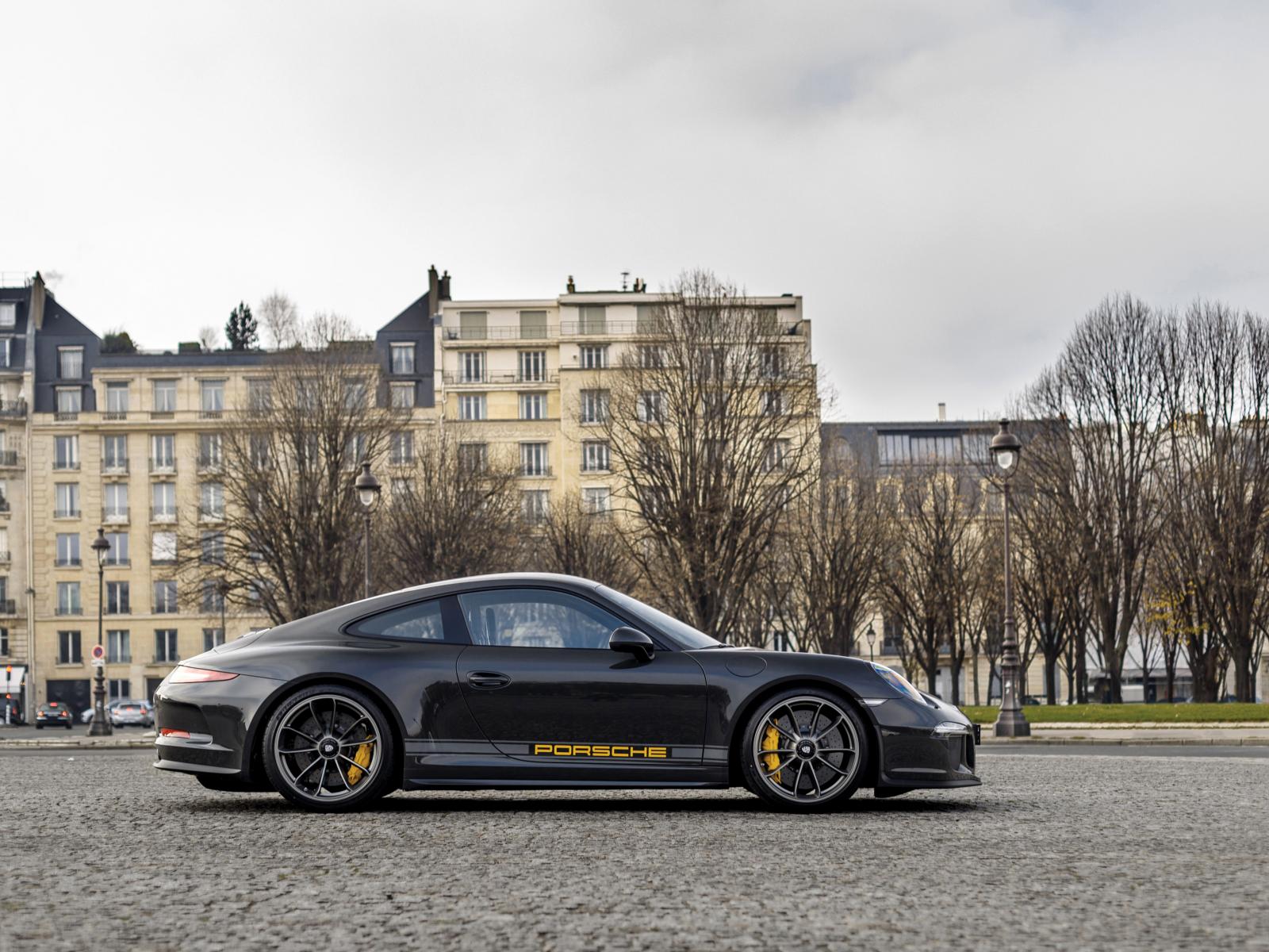 Обои Черный спортивный автомобиль Porsche 911 в городе