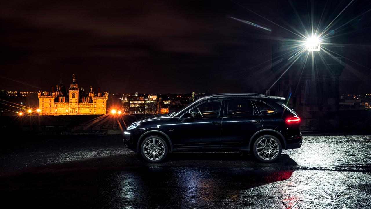 Обои Черный автомобиль Porsche Cayenne в свете фонаря