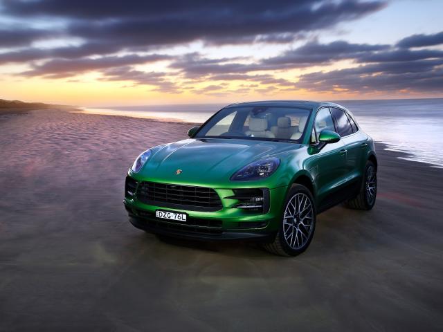 Обои Зеленый автомобиль Porsche Macan S 2019 года на берегу океана