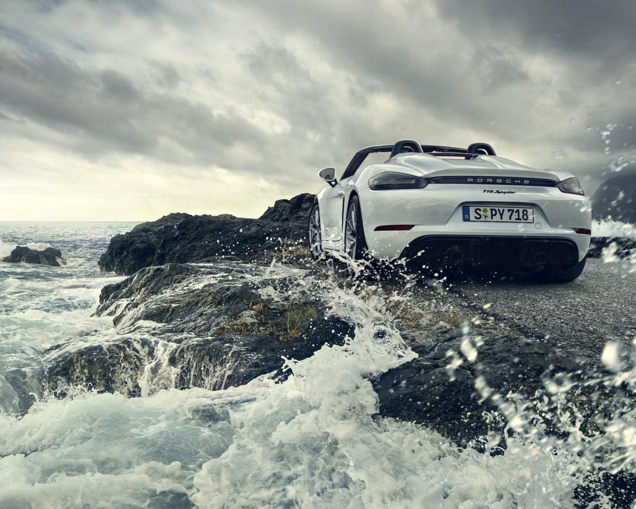 Обои Автомобиль Porsche 718 Spyder, 2019 года стоит у воды