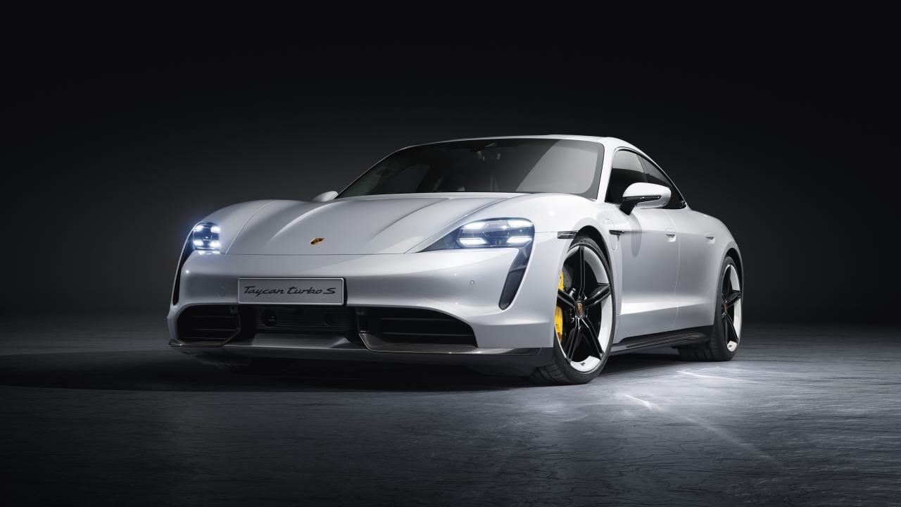 Обои Серебристый автомобиль Porsche Taycan Turbo S 2019 года на сером фоне
