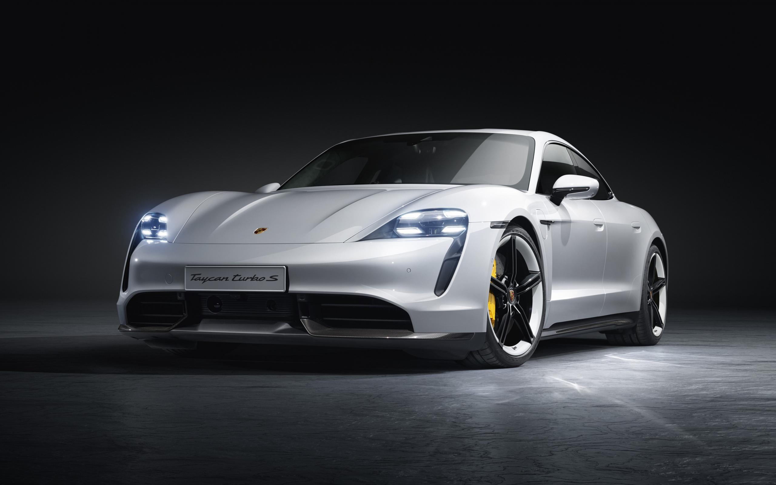 Обои Серебристый автомобиль Porsche Taycan Turbo S 2019 года на сером фоне
