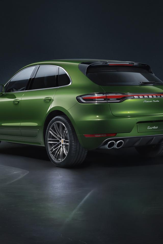 Обои Зеленый автомобиль Porsche Macan Turbo 2019 года вид сзади