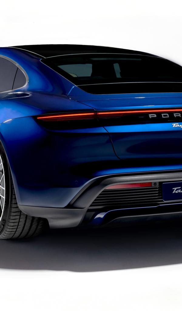 Обои Синий автомобиль Porsche Taycan Turbo 2019 года на белом фоне