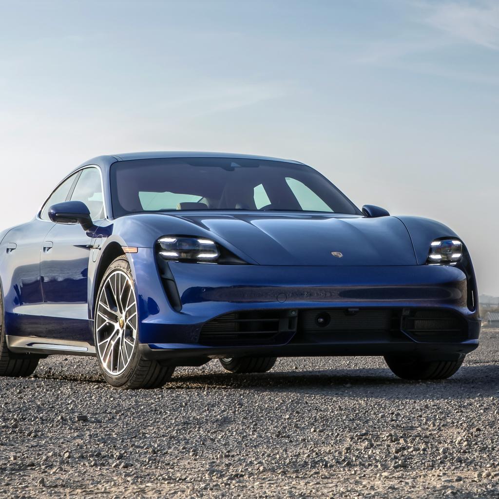 Обои Синий автомобиль Porsche Taycan Turbo, 2020 года у океана