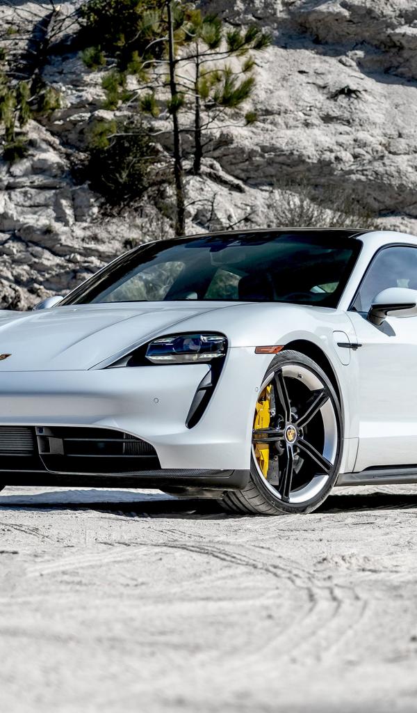 Обои Белый Porsche Taycan Turbo S, 2020 года у горы