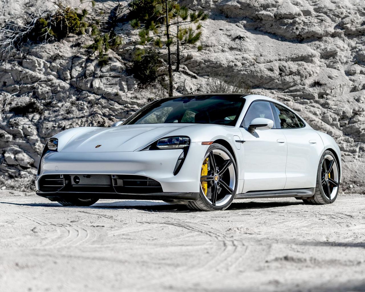 Обои Белый Porsche Taycan Turbo S, 2020 года у горы