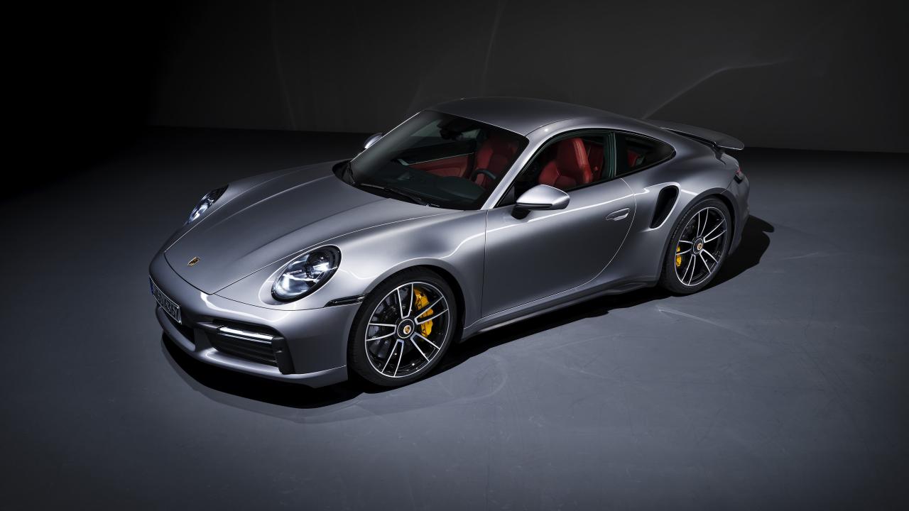 Обои Серебристый автомобиль Porsche 911 Turbo S 2020 года вид сверху