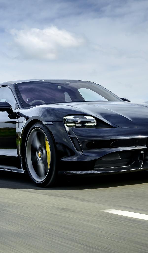 Обои Черный автомобиль Porsche Taycan Turbo S 2020 года на скорости